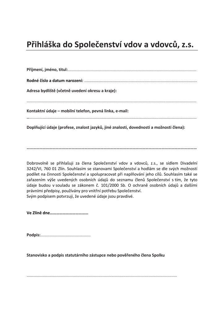 Přihláška za člena Spolku Vdov a Vdovců